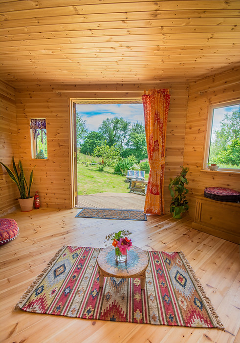 The morning sun shines warmly & brightly through the double doors, offering views out over the garden towards the pond & the young orchard. The Summer House has no mains electricity but can be cosily lit inside at night with battery operated fairy lights & stargazing is amazing here with our dark skies!